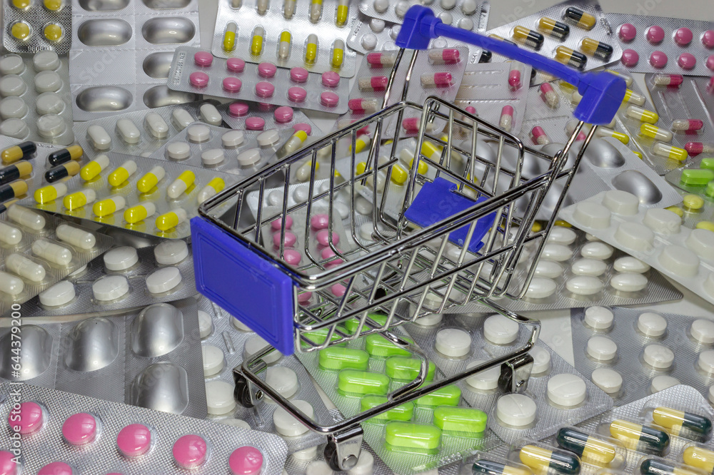 Empty decorative shopping cart stands on heap of multicolored pills, medicine shopping concept