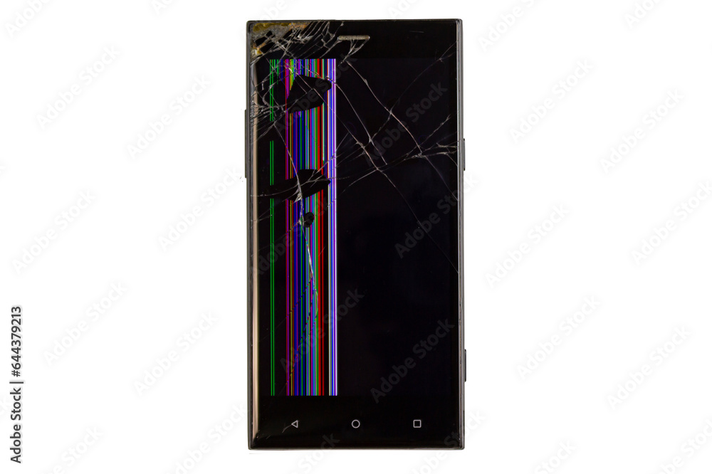 smartphone with a broken screen, with colored stripes and black spots and a black screen