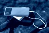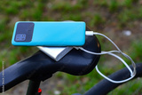 A portable charger charges a smartphone on the background of a bicycle and nature. Power Bank on a journey to charge gadgets.