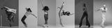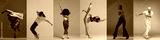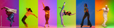 Collage. Young men and women dancing modern style dances, hip hop over multicolored background in neon light. Concept of art, choreography, creativity, hobby, movements. Banner, flyer, ad