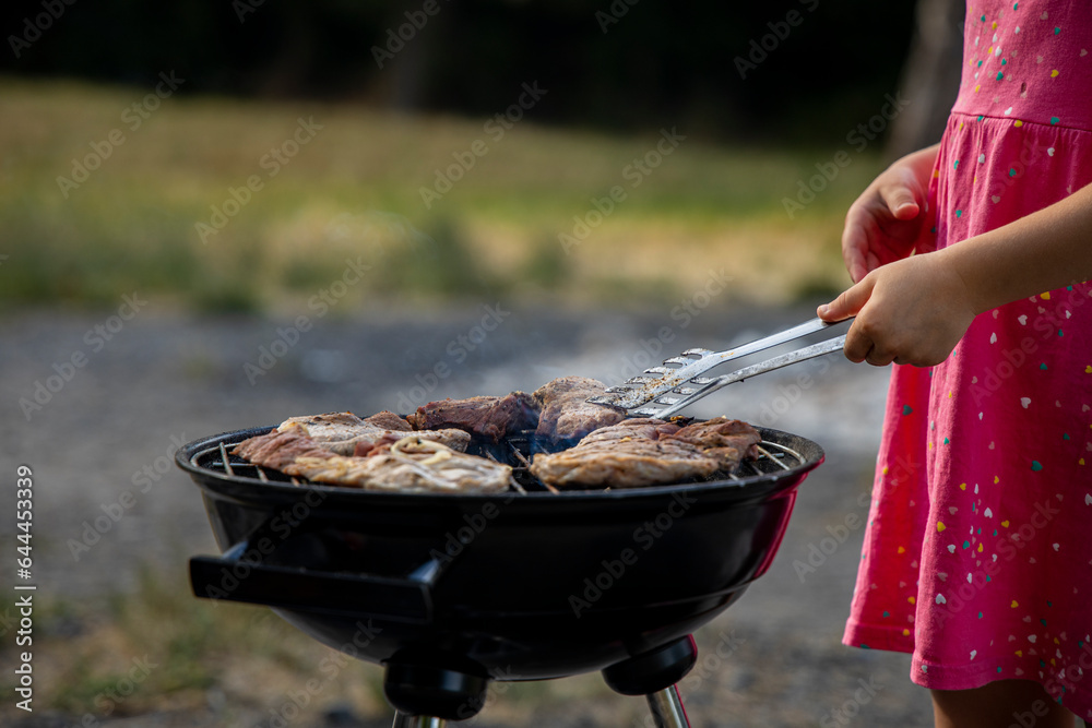 Little girl child prepares barbecue chicken meat outdoors in the park in nature