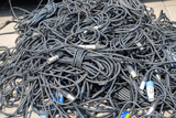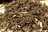 Wires from audio equipment. Tangled cables. Wires for concert equipment. Cable for lighting fixtures on ground. Tangled wires for electrical equipment. Cables for mounting concert stage