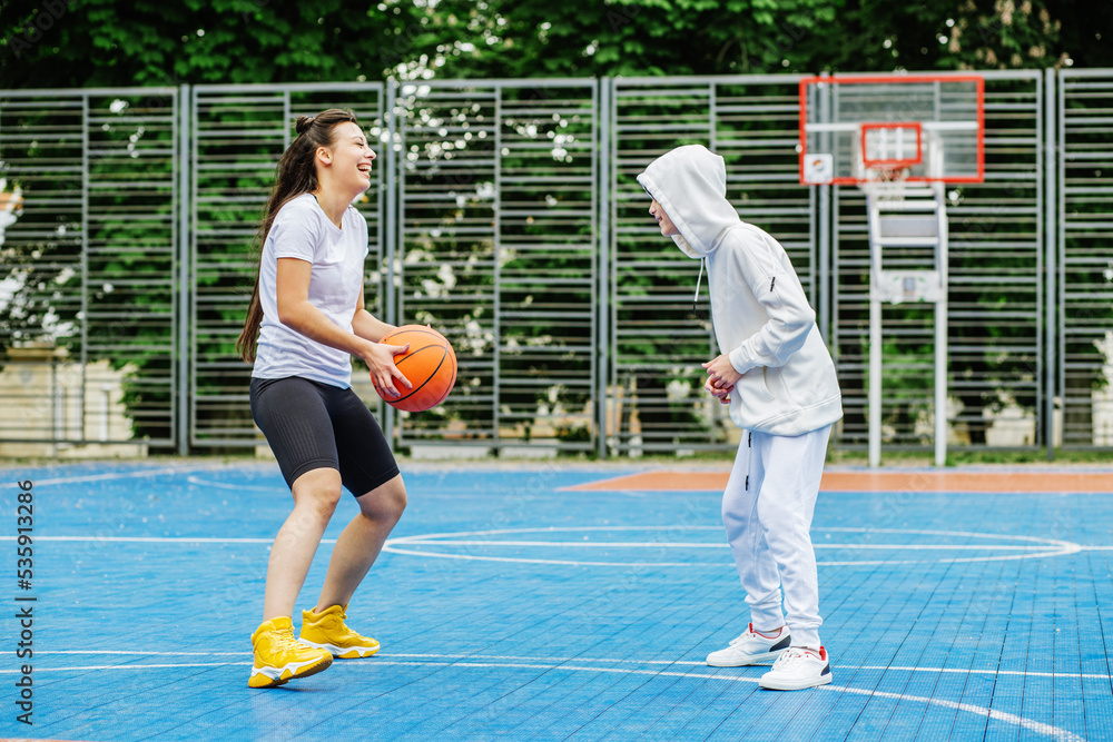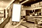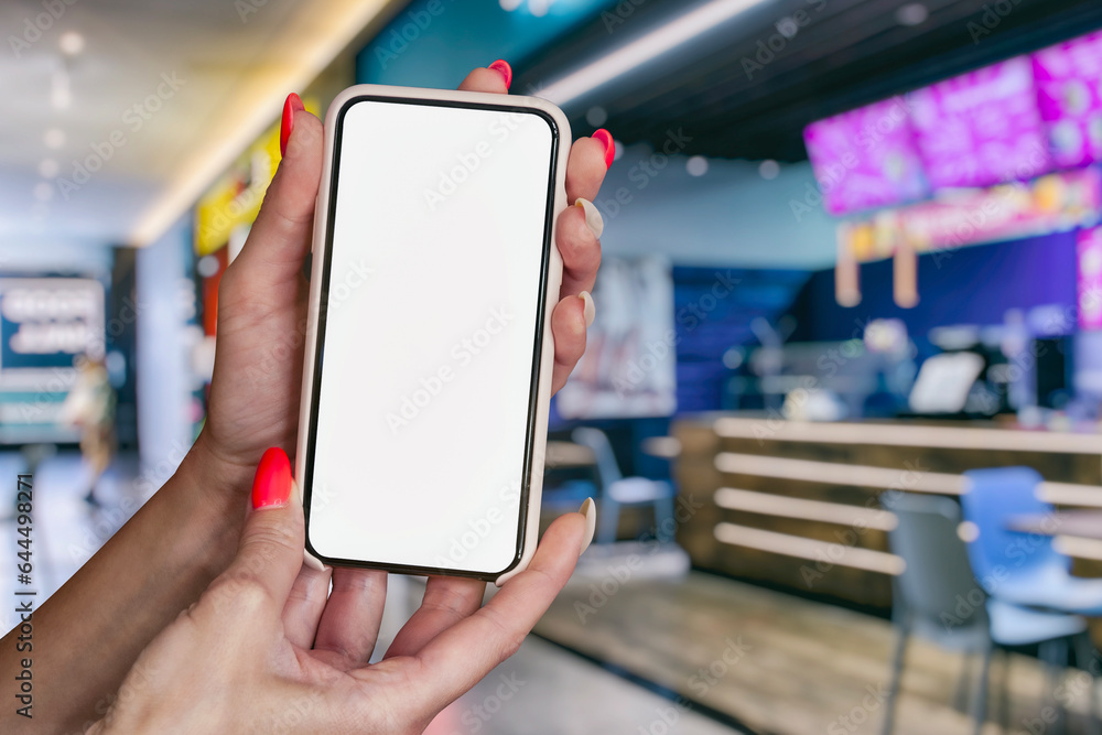 Girl holds in her hands a mock-up of a smartphone with a white screen against the background of the food court.