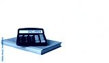 Disclaimer on the display of a calculator, which lies on a notepad and a white background.