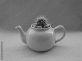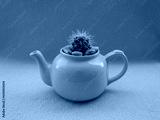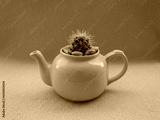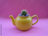 Yellow teapot with small cactus growing in it on pink background