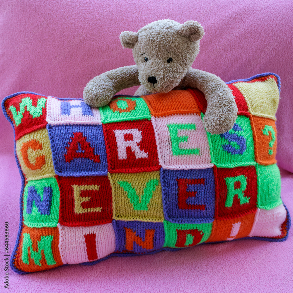 Multi colored hand knitted pillow with careless phrases and teddy bear