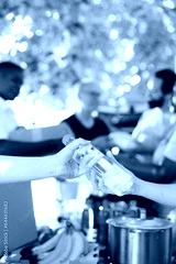 Close-up shot of caucasian pair of hands holding a water bottle at the outdoor charity food bank. Volunteers giving essential items and providing humanitarian aid to the needy and homeless people.