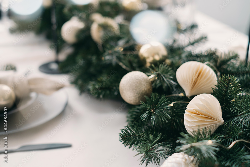 Christmas decor from craft paper on dining table. Living room interior. Christmas table setting over Defocused lights, bokeh. Eco style, pastel color