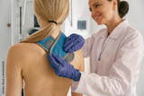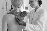 Woman doing mammogram x ray for breast cancer prevention screening at hospital