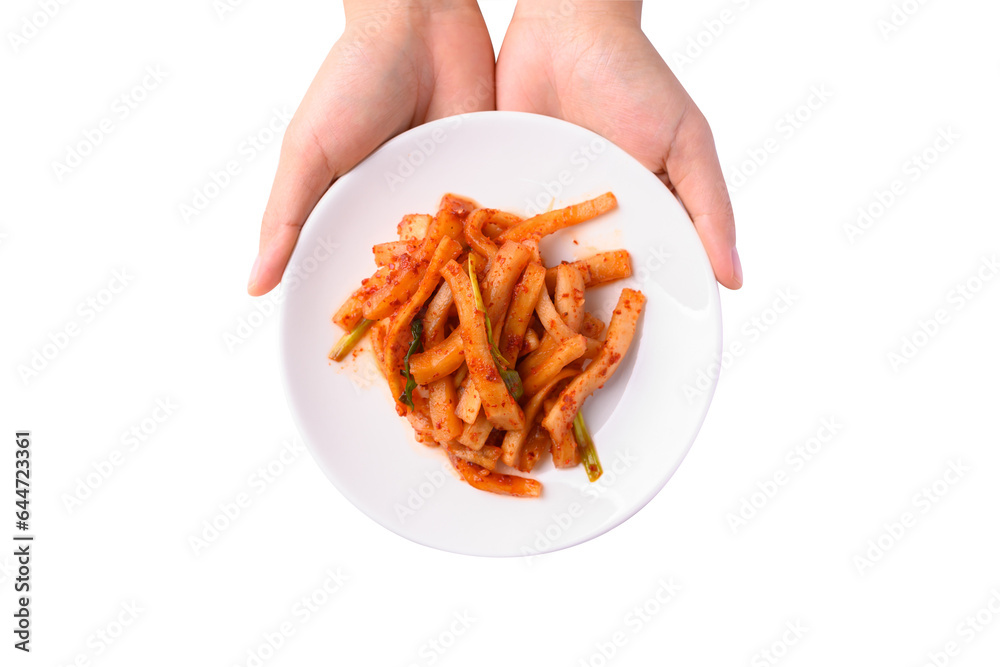 Kimchi radish with hand, Korean food homemade side dish