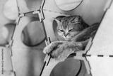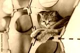 British shorthair cat (golden chinchilla) sleeping in a cat house on a white brick wall