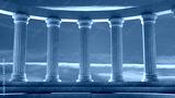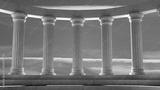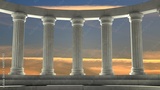 Ancient marble pillars in elliptical arrangement with orange sky