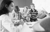 Adults and children sit around a table on which playing cards are located boy argues and discusses the rules with an adult. Game ways to solve children's conflicts concept