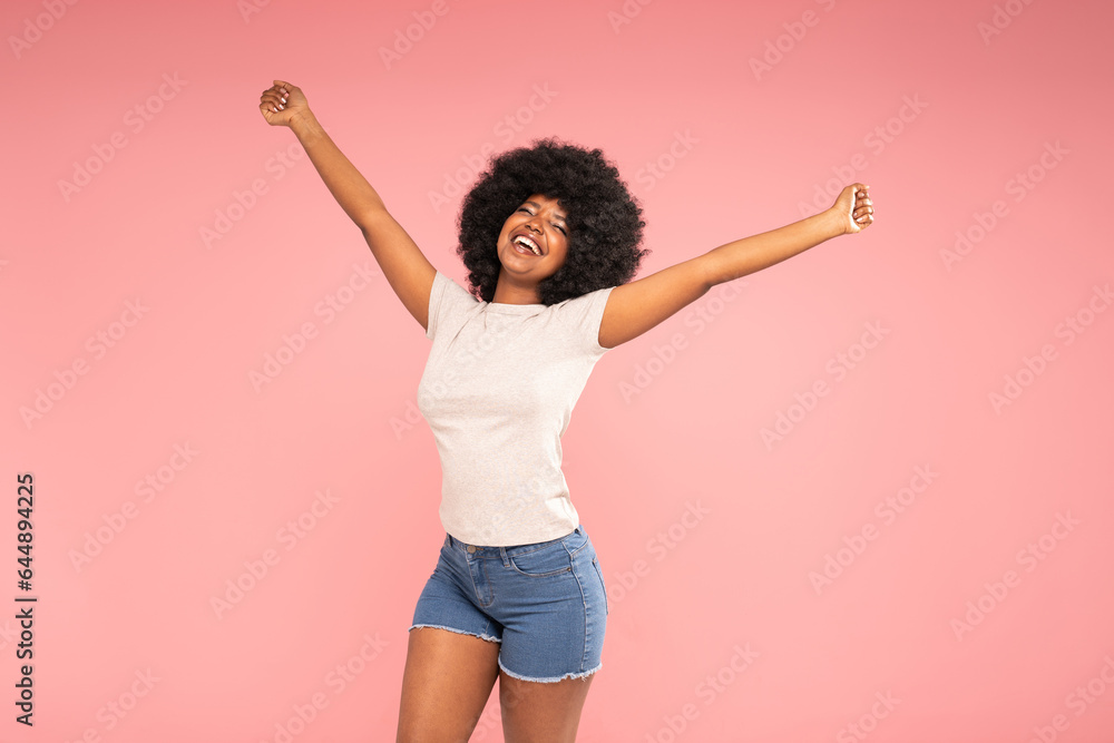 Optimistic african american woman dancing, laughing happily. Girl with afro hairstyle wearing casual tshirt and short jeans