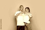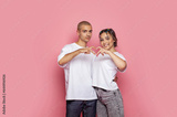 Two young people making heart. Love concept. Ypung man and woman on pink background