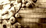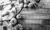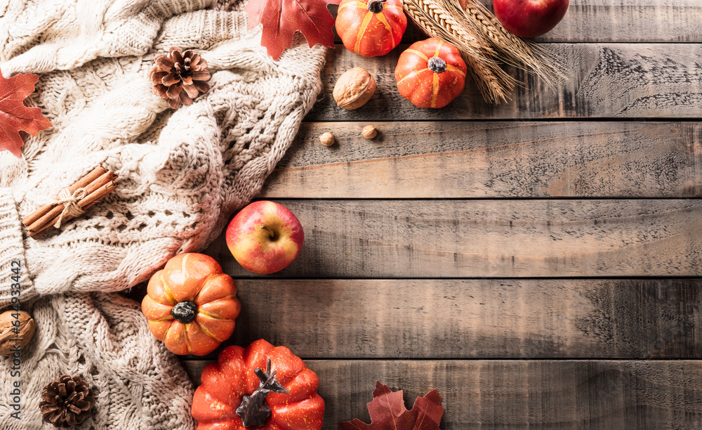 Autumn and thanksgiving decoration concept made from autumn leaves and pumpkin on dark wooden background. Flat lay, top view with copy space.