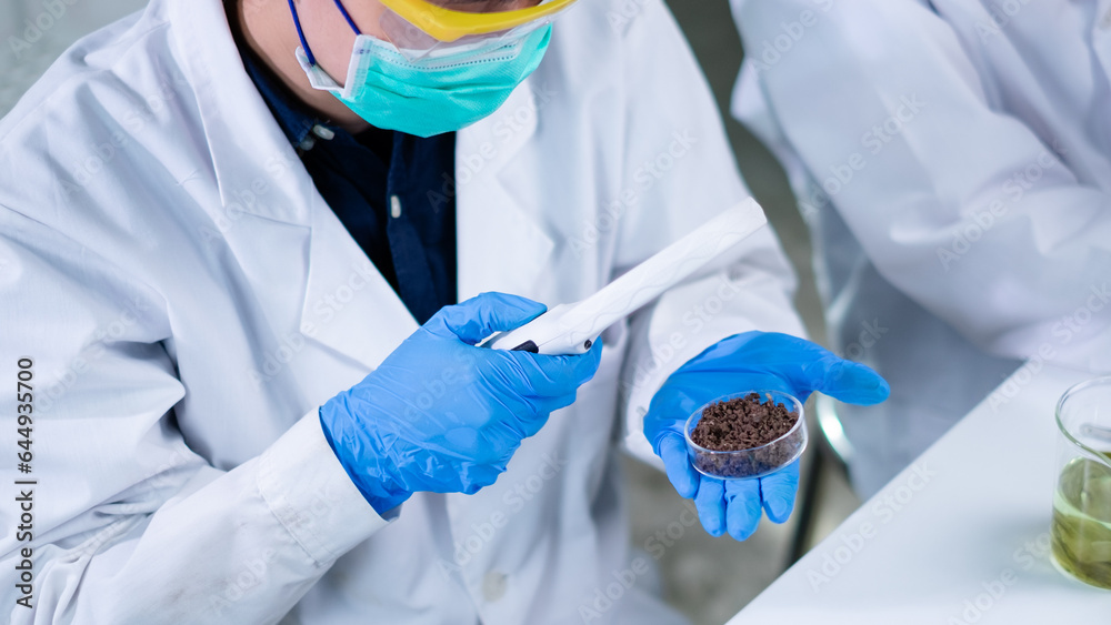 Scientist use magnifying glass to analyze soil, fertilizer or dirt sample. Biotechnology, agricultural, and geology laboratory. Exploration and developing quality of soil. Pollution and chemical test