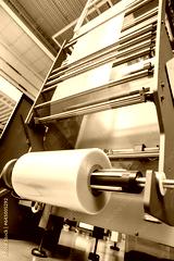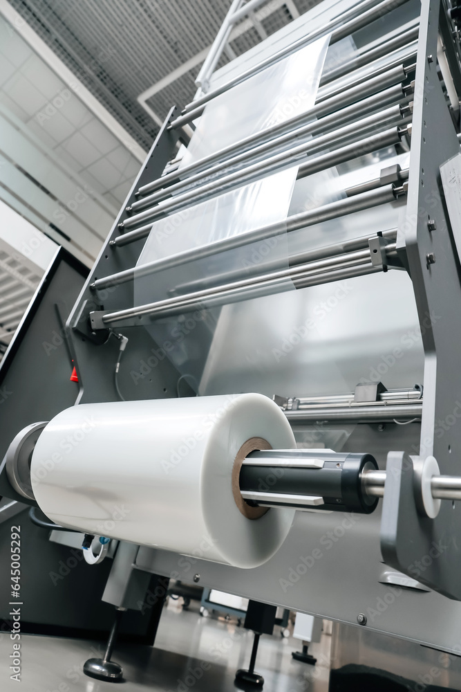 vertical bagger reelholder and film unwinding system processing of Packaging equipment on packaging machine in industrial factory. Packing food in production line. Plastic waste