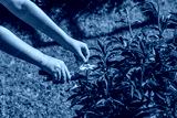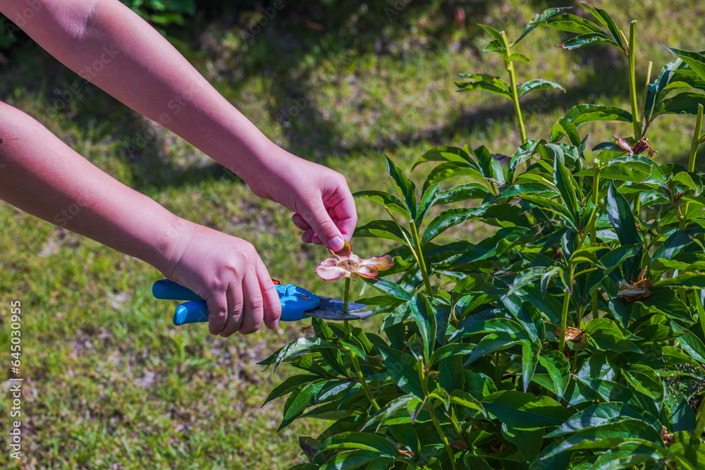 Child's hands with garden scissors cutting old flowers on peony. Gardening concept.