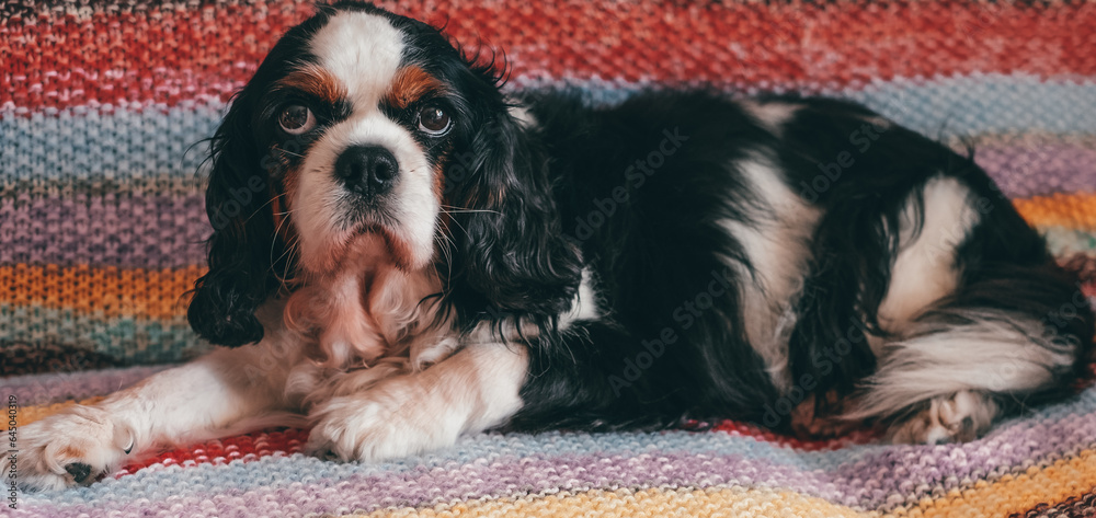 Portrait of cute old cavalier king Charles spaniel dog relaxing on home sofa looking at camera.