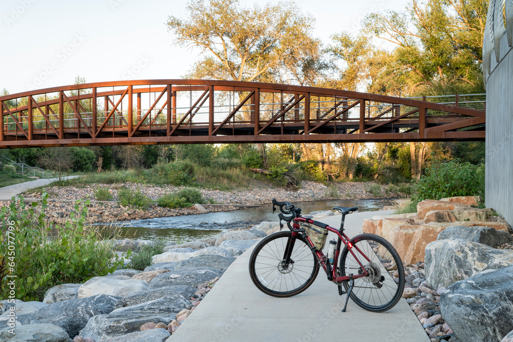 gravel touring bike bike at whitewater park on the Poudre River in downtown of Fort Collins, Colorado, late summer scenery