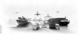 Global business logistics import export of containers cargo freight ship loading at port by crane, container transport, cargo plane, truck to port background