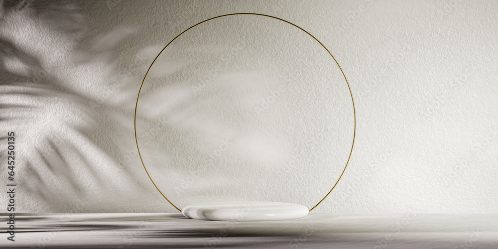 Product presentation. minimal scene with cylinder podium and leaves shadow. Stage mockup showcase for product, banner, sale, presentation, cosmetic and discount. 3d rendering