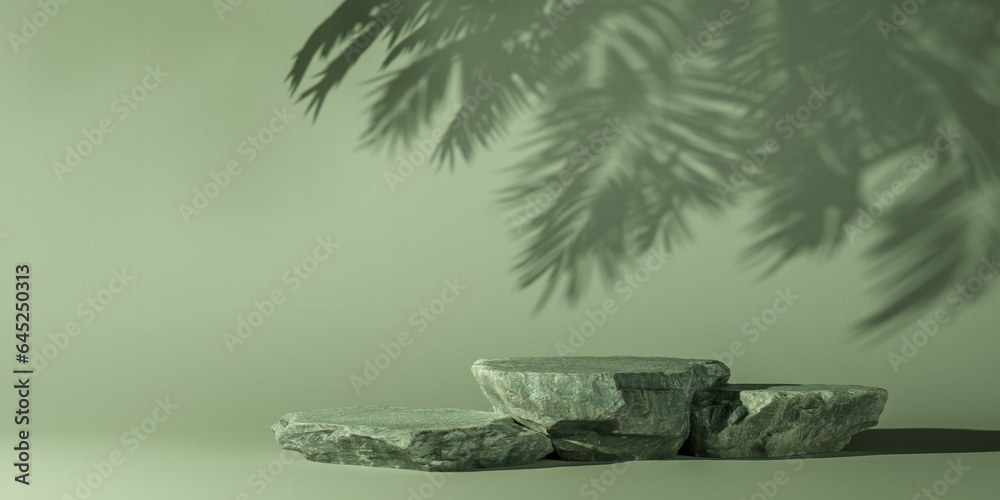 Minimal background for cosmetic presentation. Luxury three stone product placement podium, platform, stage on green concrete wall with palm shadow. 3d rendering