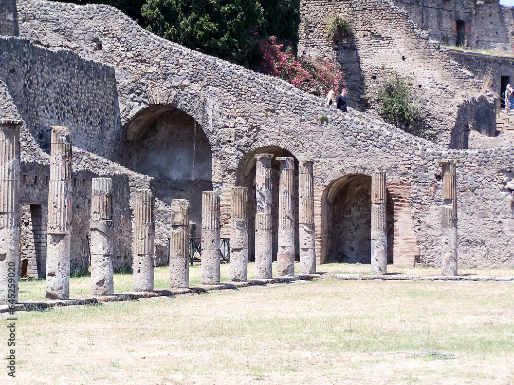 Carved pillars inside the amphitheatre at Pompeii, Italy