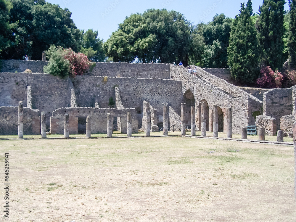 Carved pillars inside the amphitheatre at Pompeii, Italy
