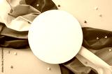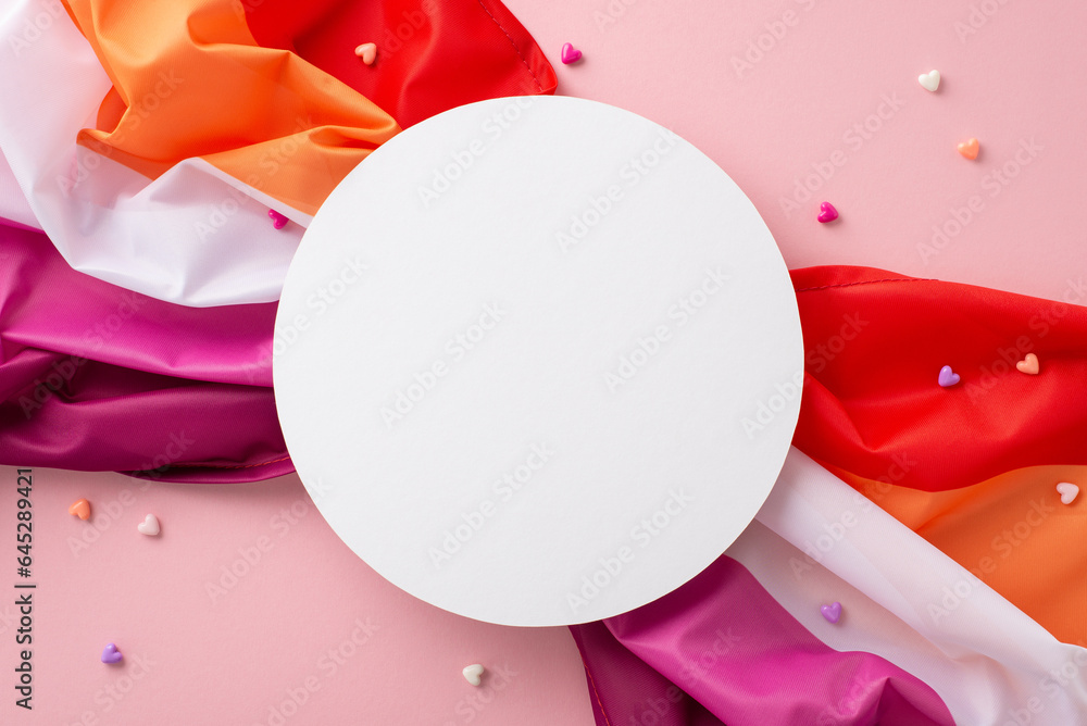 A visually appealing composition for International Lesbian Day: top view of Lesbian Pride flag, hearts, set against a pastel pink backdrop with blank circle for text or advertising