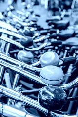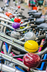 Bicycles parked in a neat row, Amsterdam, North Holland, Netherlands.