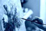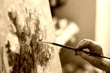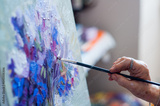 Senior woman's hands using a brush painting an oil painting with out of focus background