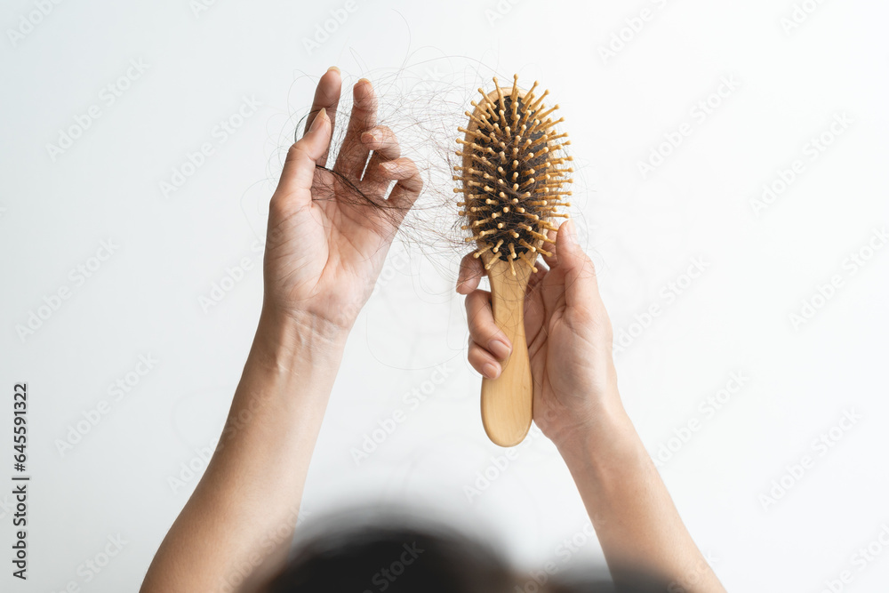Close-up young woman brushing her hair and have many hair loss on the comb