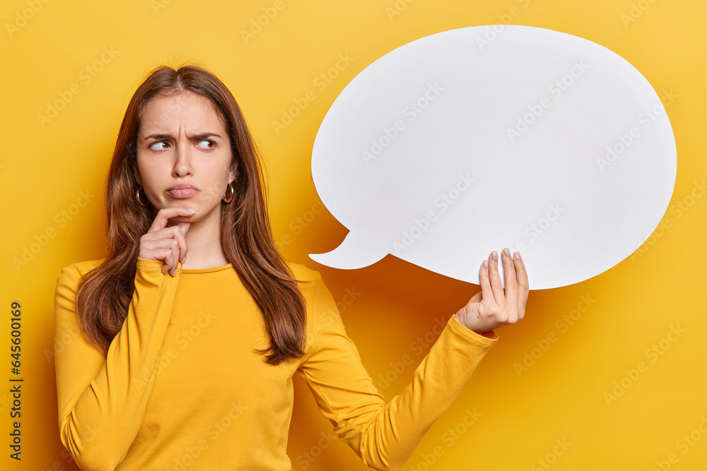 Horizontal shot of displeased long haired European woman keeps hand on chin looks aside concentrated on something holds white empty speech bubble for your promotion isolated over yellow background