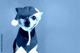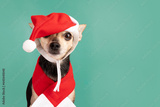 dog in santa hat and christmas scarf on green background,copy space