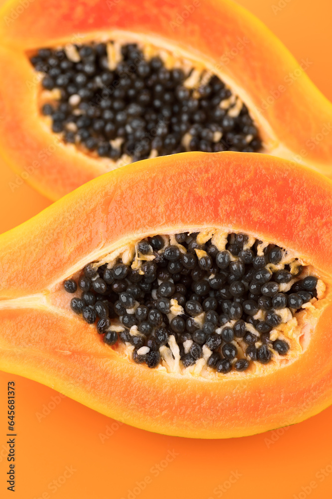 Papaya fruits on orange, yellow background. Halved fresh organic Papaya exotic fruit border design, close up. Vertical image