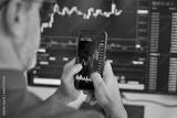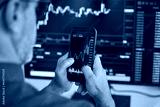 Investor trader broker analyzing financial crypto stock trade market on smartphone risk digital price data in mobile app buying bank shares, doing investment strategy analysis on phone. Over shoulder.