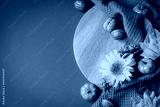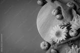 Autumn Thanksgiving board. Sunflower, pumpkins, yellow leaves, nuts, brown background. Autumn template