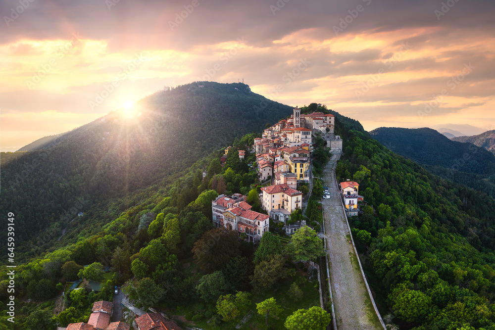 Panoramic aerial view of Sacro Monte di Varese during golden hour, Santa Maria del Monte, Varese, Italy
