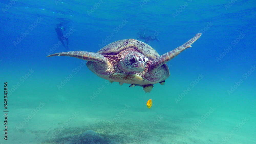 Green turtles are the largest of all sea turtles. A typical adult is 3 to 4 feet long and weighs between 300 and 350 pounds.