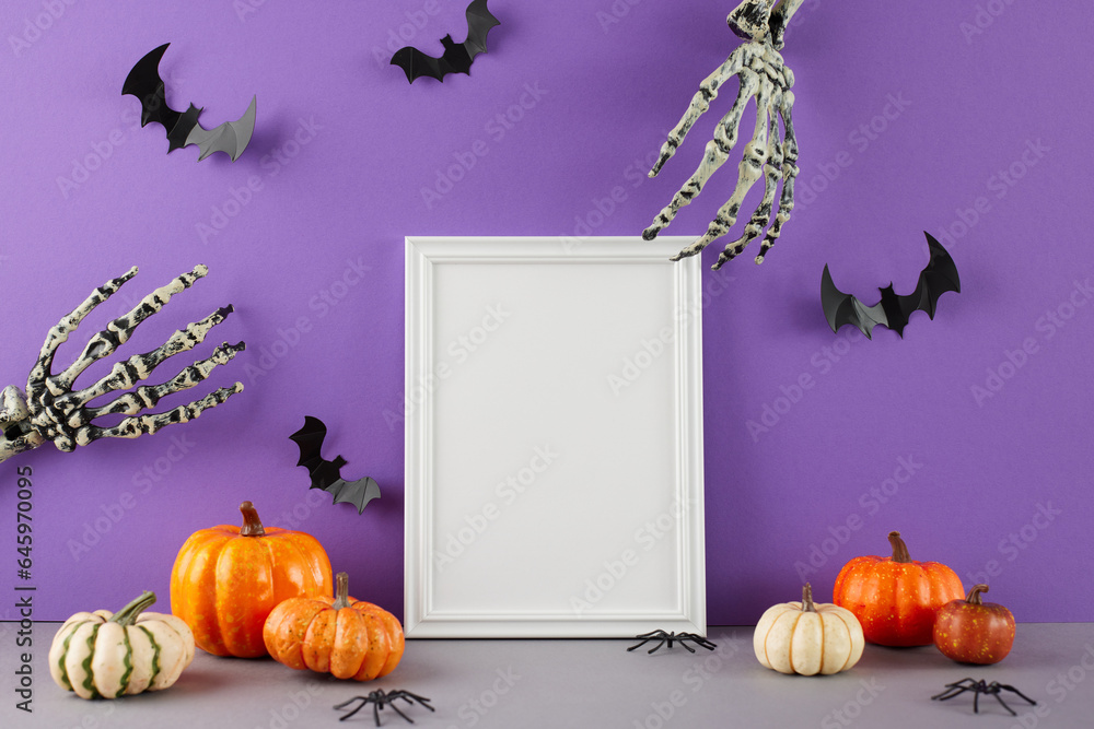 It's time to get set for Halloween. Side view of scary skeleton hands, pumpkins, spooky spiders and bats on the table on purple background with frame for text or advert