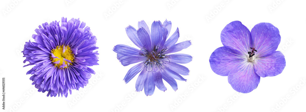 Set of different purple flowers (aster; geranium; chicor) isolated on white or transparent background. Top view.