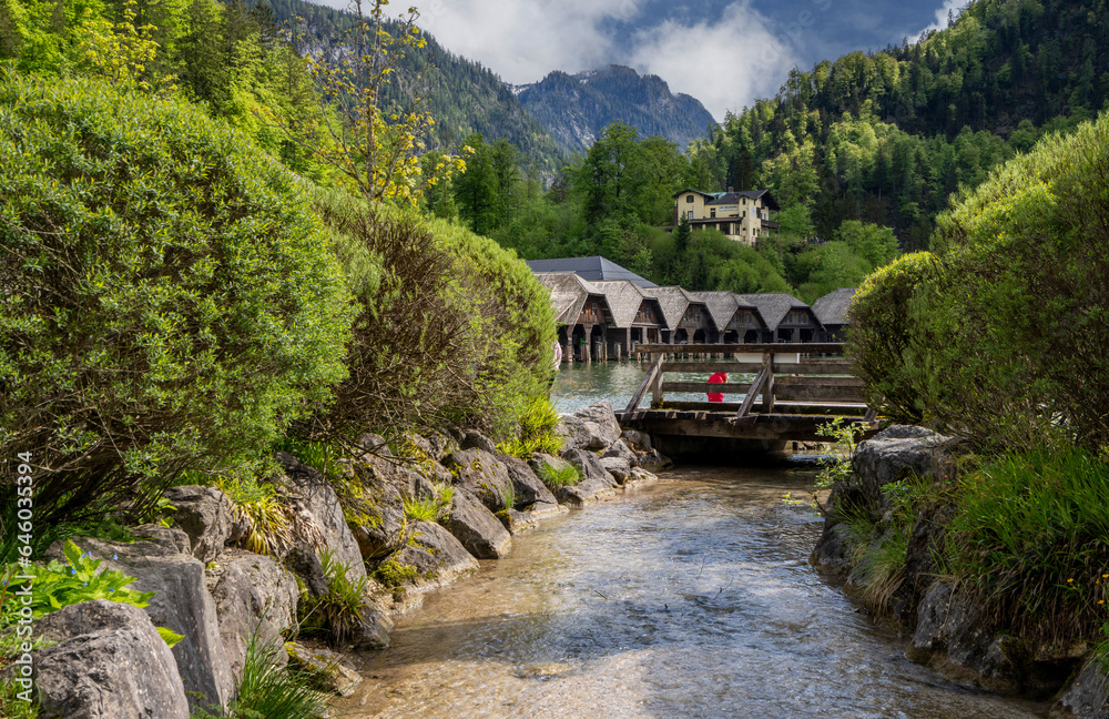 Bootsanleger und Holzschuppen, Schifffahrt amm Königssee, Berchtesgadener Land, Bayern, Deutschland