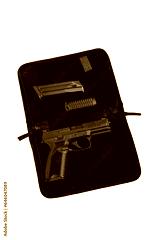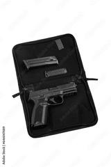 Modern semi-automatic pistol. A short-barreled weapon for self-defense. Arming the police, special units and the army. Weapon in a case for storage and transportation. Isolate on a white back.