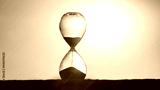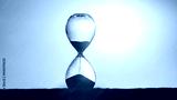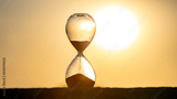 Hourglass counts the length of time against the background of the evening sun. The concept of the fluidity of life time in the universe. time and light