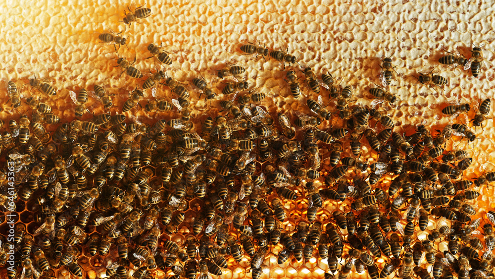 Closeup of honey bees on wax honeycomb with hexagonal cells for apiary and beekeeping concept background