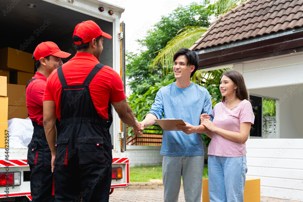 The husband standing behind truck shakes hands with the employee after checking the item list or furniture in the delivery report. During delivery or relocation service in the delivery concept.