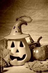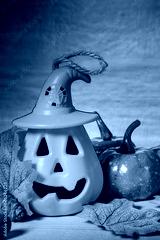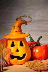Scary halloween pumpkin on wooden planks.