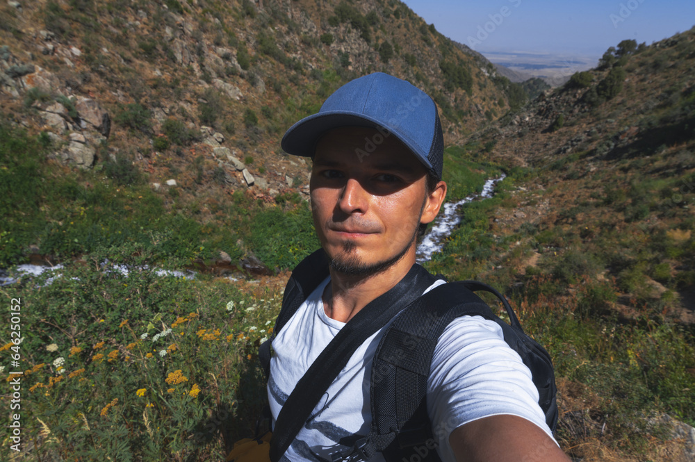 Selfie of a white Caucasian male tourist with a beard on a hike in the Kaskasu gorge by the river in the mountains in summer
